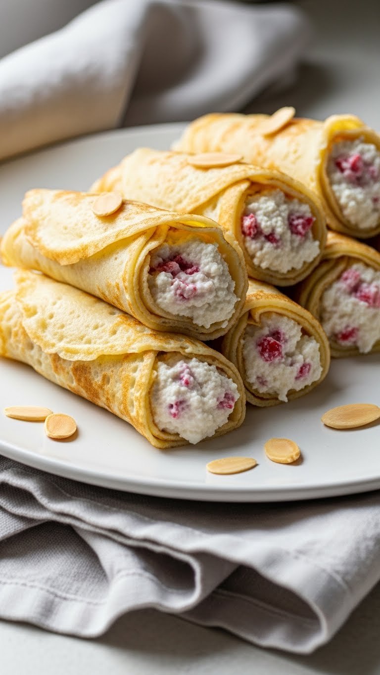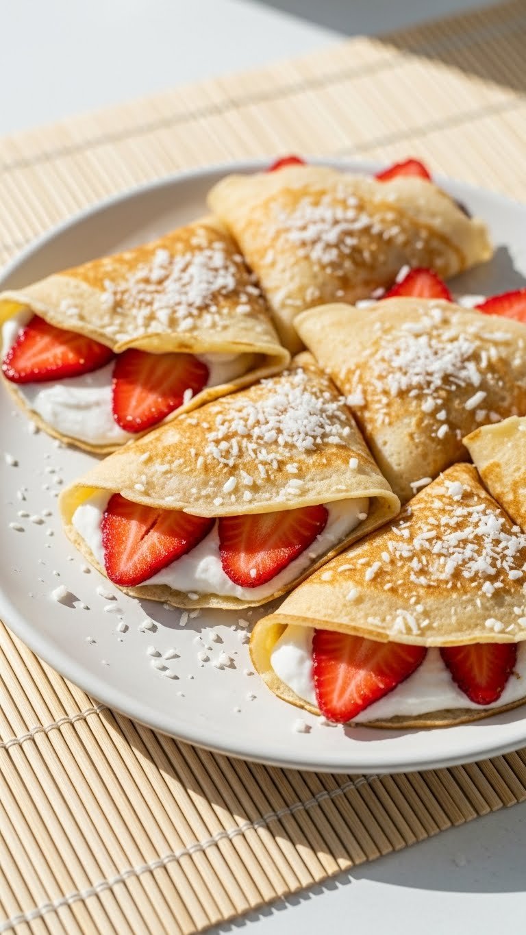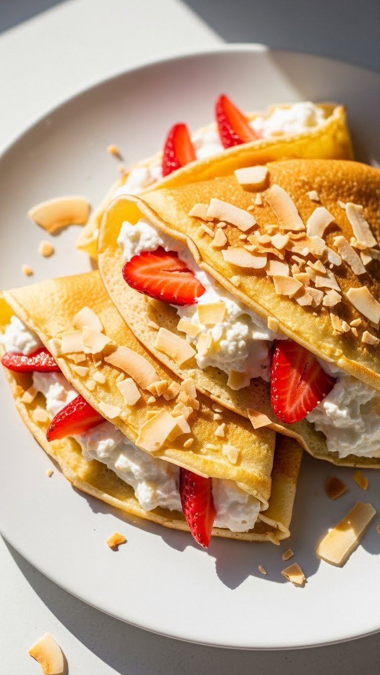 Cream cheese blended with coconut makes a tangy, tropical filling that complements strawberries. These crepes are creamy and slightly tangy with a toasted coconut finish. They’re a nice option if you want a richer filling without heavy cream. You’ll notice sweet coconut aroma with fresh berry brightness.