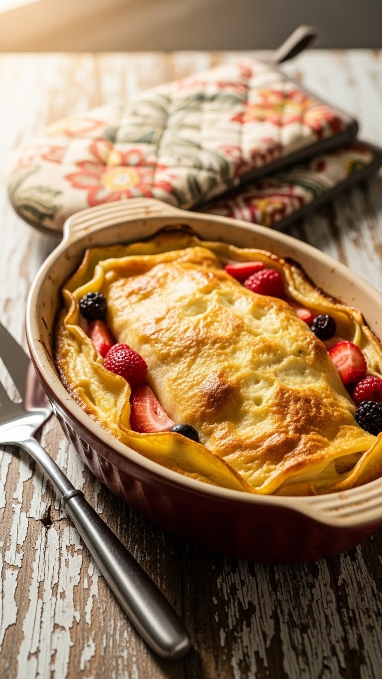 - Bake 30–35 minutes until top is golden and custard set; toothpick inserted comes out clean.
