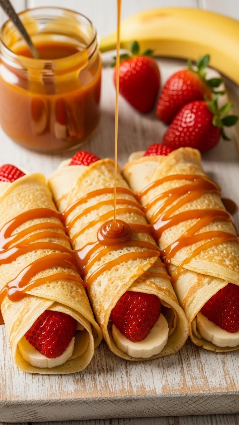 This pairing combines bananas and strawberries with a salted caramel drizzle. The result is sweet, slightly salty, and very comforting. Crepes stay tender and are easy to assemble for kids or brunch guests who love fruit-forward sweets. You’ll taste caramel richness and ripe banana softness.