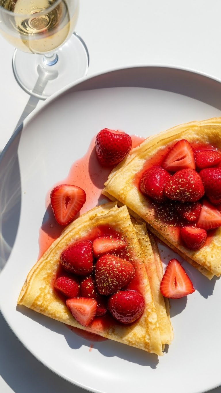 Champagne adds a celebratory note to strawberry compote spooned over delicate crepes. The compote is slightly boozy and glossy, brightened by citrus. Perfect for special brunches like birthdays or anniversaries. You’ll notice an airy sparkle and a warm fruit aroma.