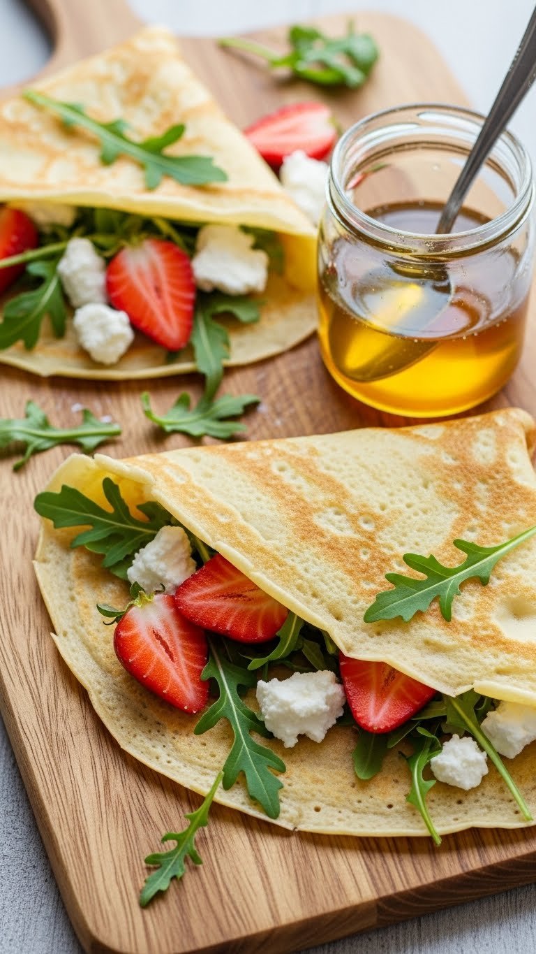 This savory take pairs tangy goat cheese and peppery arugula with sweet strawberries. The contrast creates a sophisticated flavor profile for brunch guests who prefer less sugar. Crepes are slightly crisp at edges and soft inside. Expect a bright, herbal aroma and creamy tang.