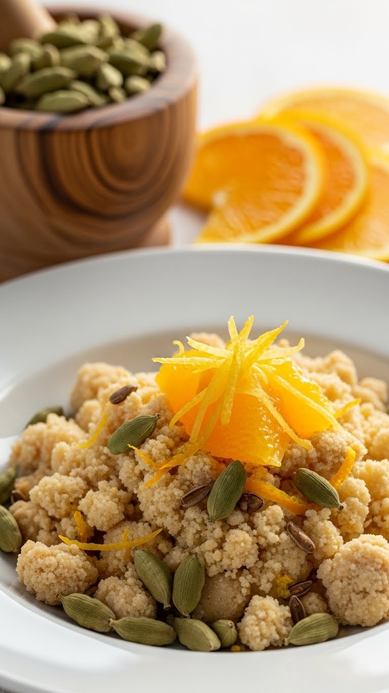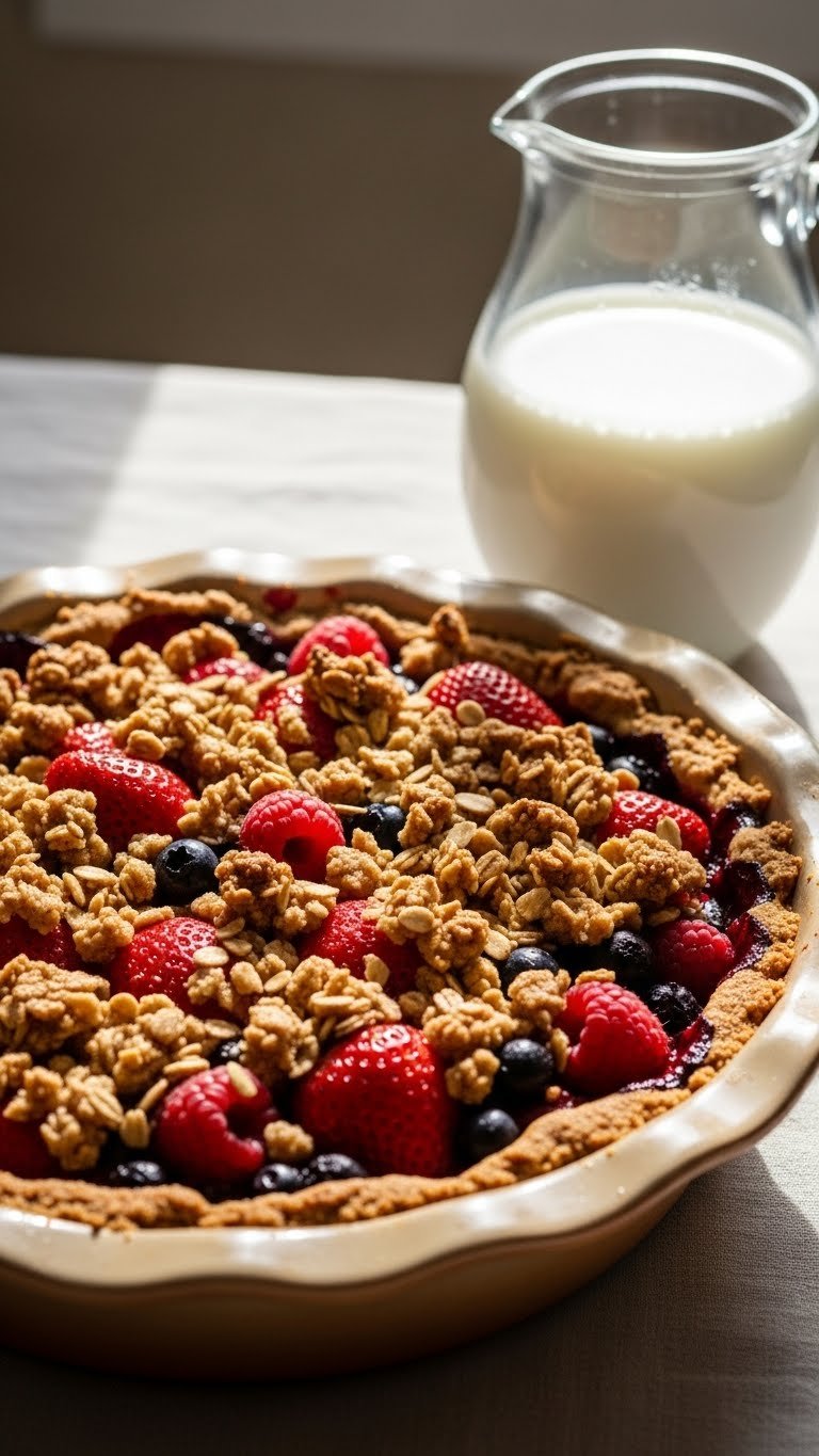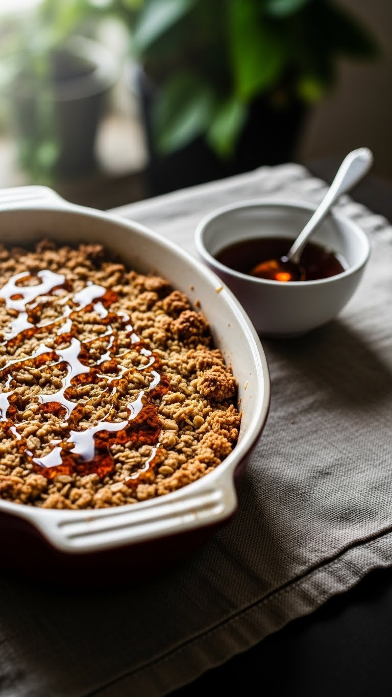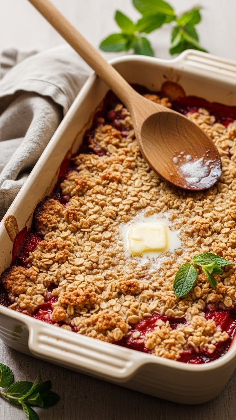 Cardamom and orange zest lift this warm strawberry crisp into fragrant territory. The spice adds floral warmth while orange brightens the berries. It’s a sophisticated version for brunch or teatime. Expect a citrusy perfume and warm spice notes on each spoonful.