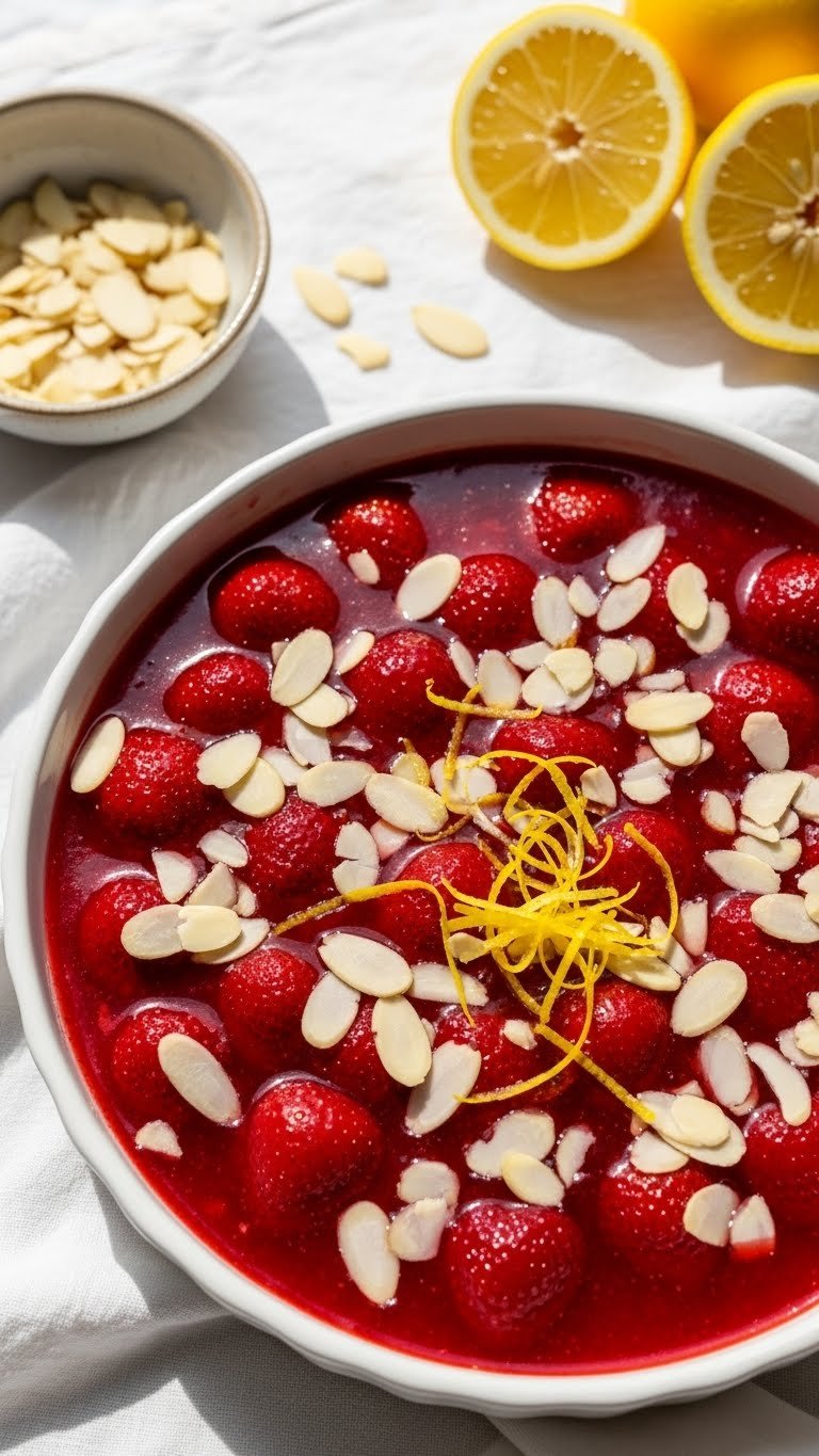 Bright lemon zest and toasted almonds make this warm strawberry crisp sing. The lemon lifts the sweet berries, while almonds add a delicate crunch. It’s light, fragrant, and great for spring gatherings or after-dinner treats. If you like a citrus twist, this one will smell lemony and look jewel-like on the plate.