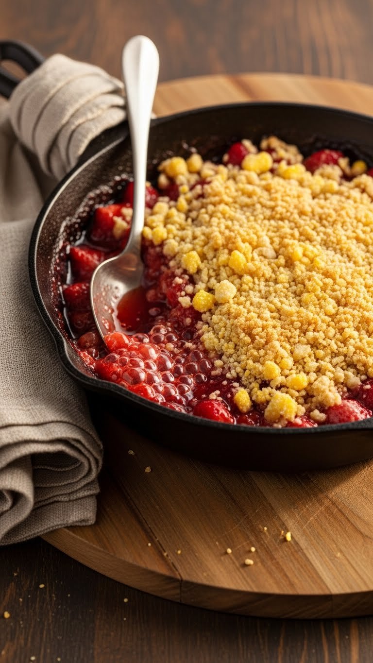 This skillet warm strawberry crisp gives rustic charm and crunchy cornmeal texture. The cornmeal adds grit and a slightly nutty note to the oats. It’s baked in one pan, so it’s great for impromptu dessert or camping-style dinners at home. You’ll smell caramelized edges and see bubbling fruit tucked under a golden crust.