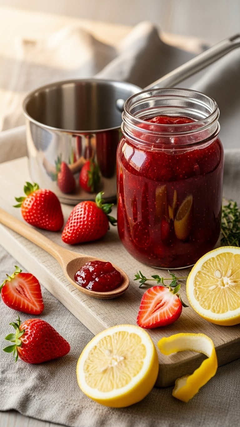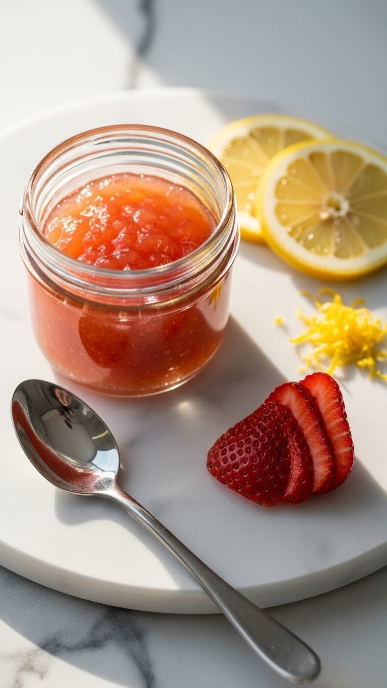This low-sugar lemon-strawberry jam keeps more berry flavor and less sweetness. It uses low-sugar pectin to set with only 1/2–3/4 the usual sugar. Texture is thick yet spoonable, with bright citrus notes. Perfect for people who prefer tart and fruity spreads. You’ll notice a fresh, clean aroma and a delicate pink color.