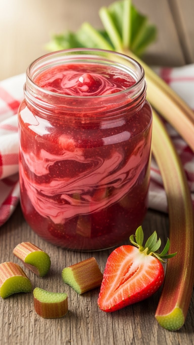 - Sterilize jars and warm them. Combine rhubarb and strawberries in a large heavy pot.