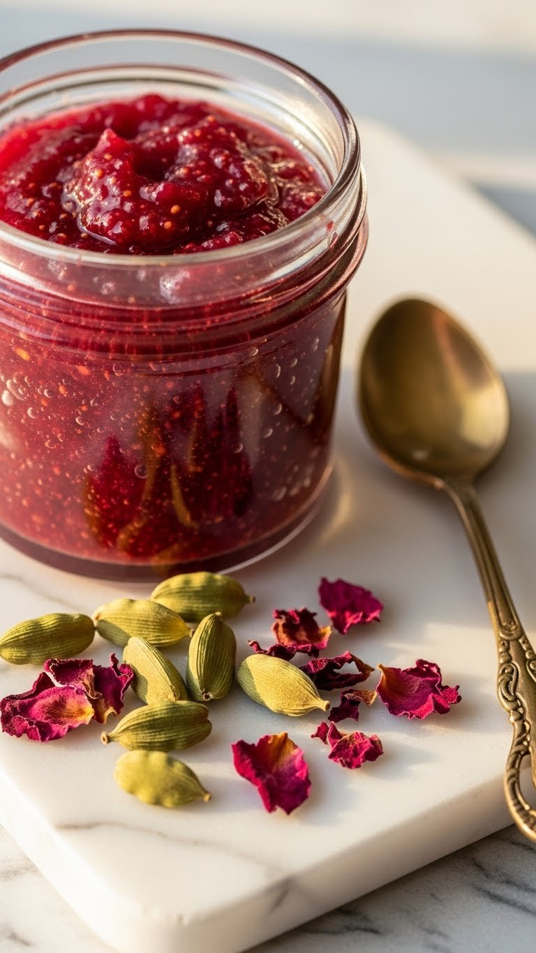 This strawberry jam combines delicate rose and bright cardamom for an elegant, aromatic preserve. The texture is smooth with faint spice flecks and a perfume finish. It pairs beautifully with Middle Eastern-inspired breakfasts and desserts. You’ll notice a fragrant rose aroma and warm cardamom on the finish.