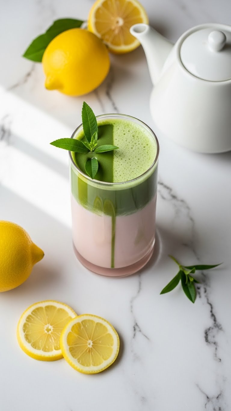 - Float matcha gently on top. Garnish with a basil sprig and lemon wheel.