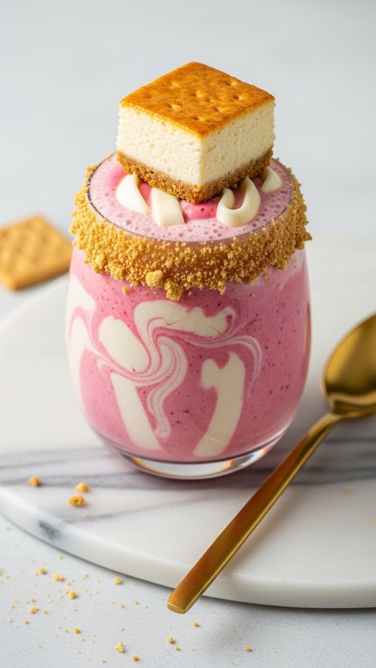 Serve in a wide cocktail glass with a dessert spoon and straw. Garnish with crushed graham crackers and a small cheesecake bite. Pair with espresso or fresh fruit. Store any leftover in the freezer up to 24 hours; thaw 10 minutes before serving. Make-ahead: soften cream cheese and chill strawberries an hour ahead.