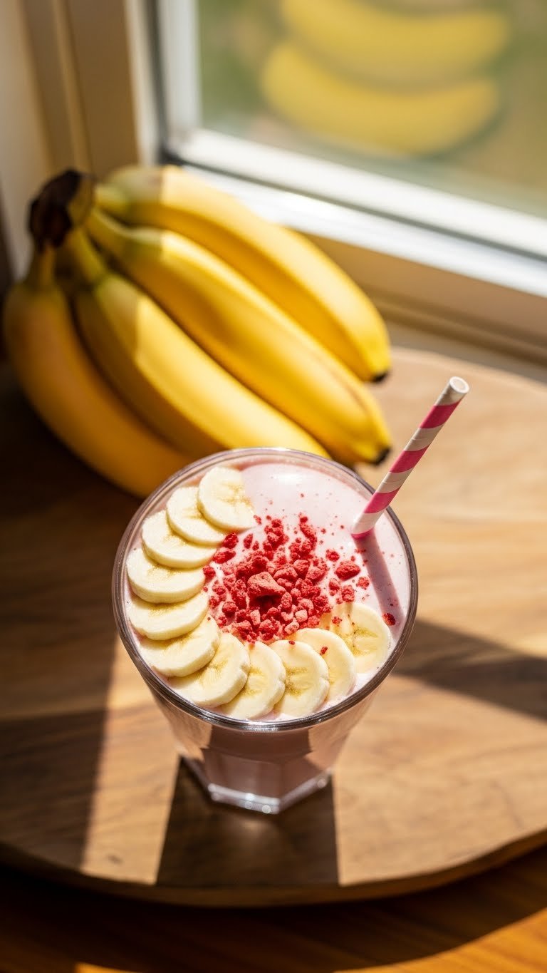 - Pour into glass and garnish with banana slices and freeze-dried strawberries.