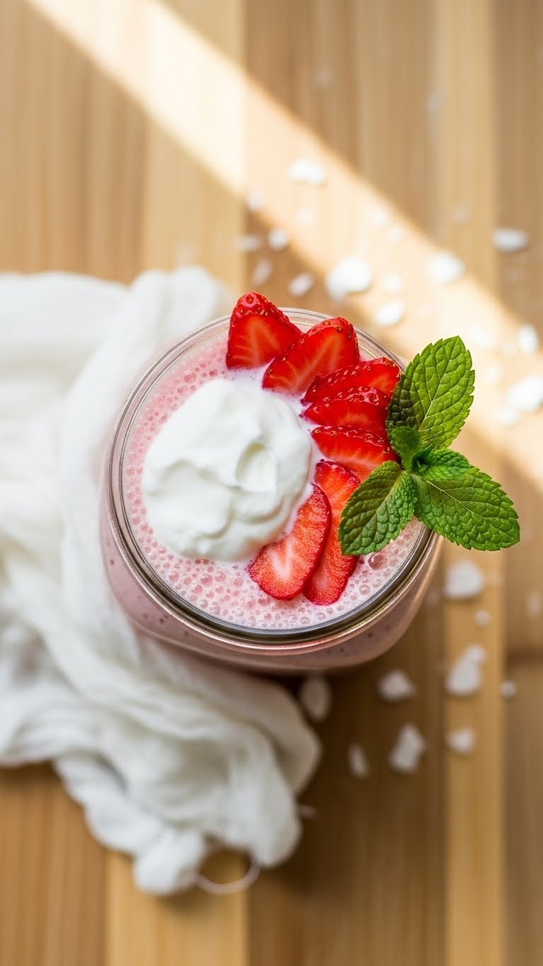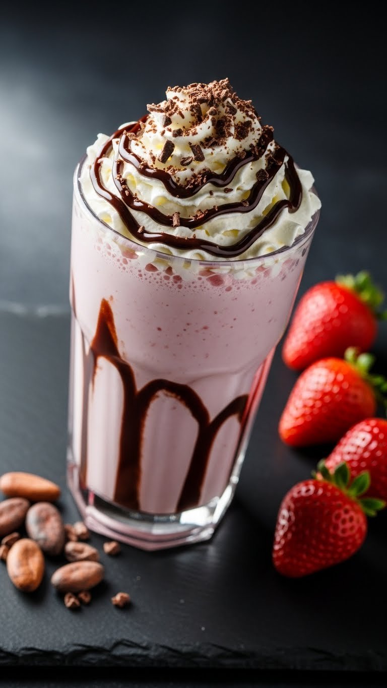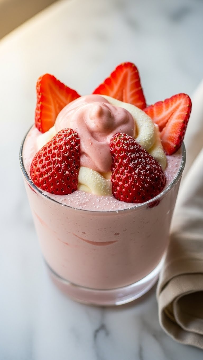 Serve in a chilled tall glass with a wide straw. Garnish with whipped cream and a sliced strawberry on the rim. Pair with crispy fries or a warm brownie. Store leftovers in an airtight container in the freezer for up to 2 days; let soften 5–10 minutes before serving. Make-ahead tip: macerate strawberries up to 2 hours ahead.
