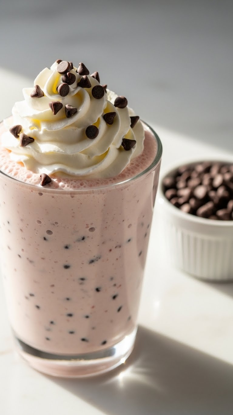 Serve in a chilled glass with a wide straw. Top with whipped cream and a sprinkle of chips. Pair with shortbread or a chocolate-dipped strawberry. Leftovers can be frozen for 24 hours; chips will soften. Make-ahead: freeze chips on a tray so they stay crisp.