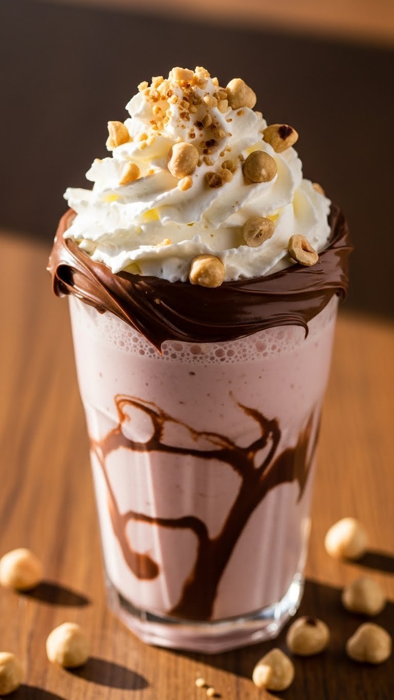 Serve in a chilled glass with a wide straw. Drizzle Nutella and add toasted hazelnuts for crunch. Pair with biscotti or chocolate cookies. Store leftovers in the freezer for 24 hours; thaw slightly before serving. Make-ahead: toast hazelnuts a day ahead.