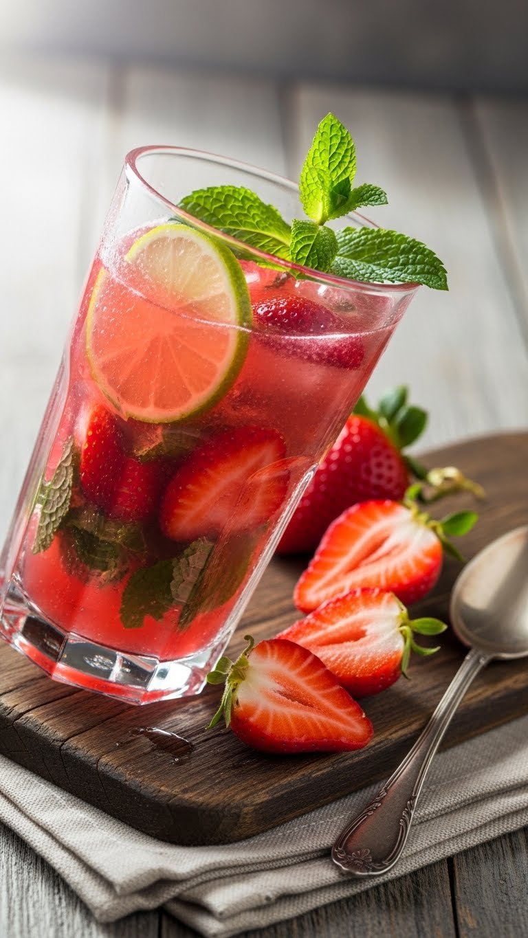 Serve in a tall chilled glass. Skewer a strawberry and lime wheel for a pretty rim garnish. Pair with light seafood or tacos. Store any leftover base (no soda) in an airtight jar for 24 hours. Make the mojito ahead by muddling berries and mint, then add soda just before serving. Perfect for casual summer dinners and backyard gatherings.