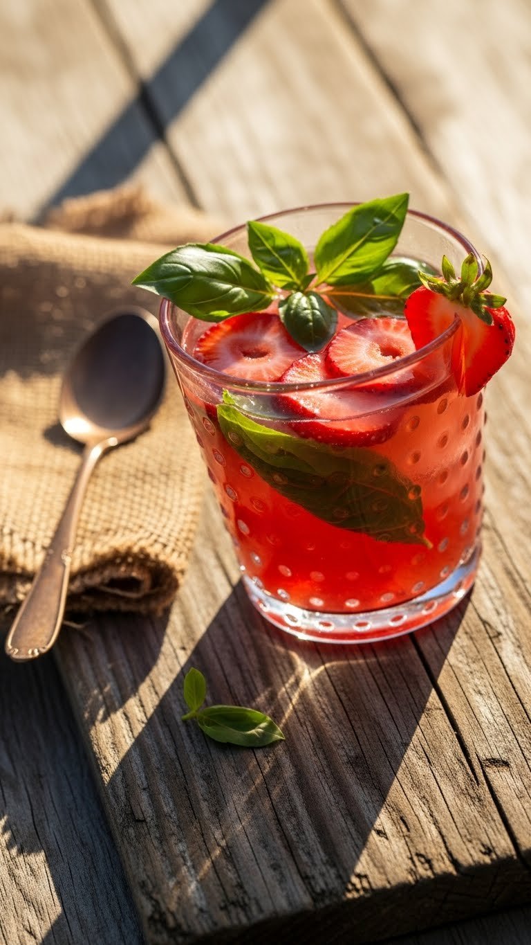 - Garnish with a basil sprig and strawberry slice.