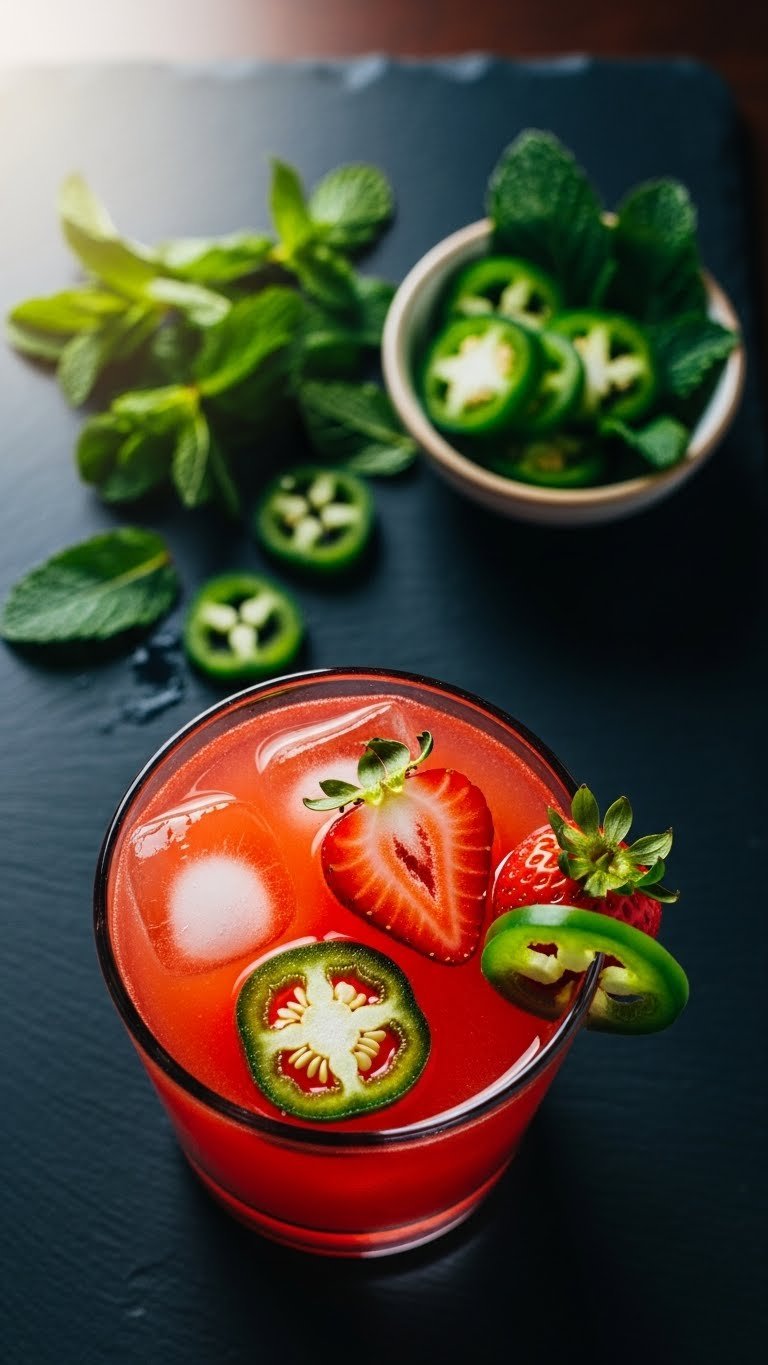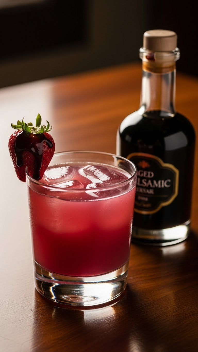 You’ll notice tart strawberry, mint freshness, and a glossy balsamic finish. It works well as a dinner cocktail.