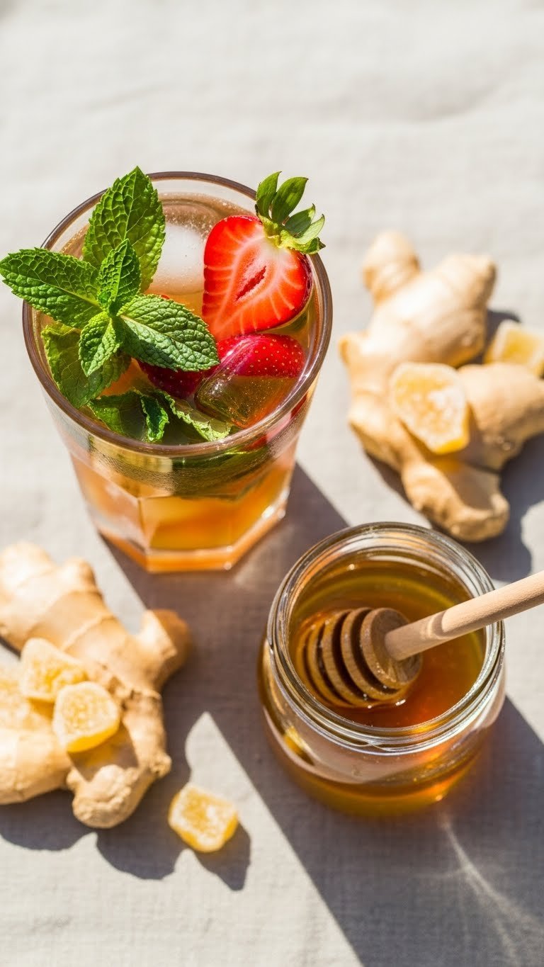 - Muddle 8 strawberries, 10 mint leaves, and 1 tbsp grated ginger with 2 tbsp honey syrup.