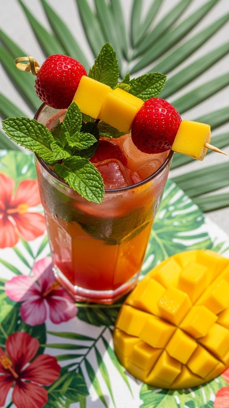 Serve in a tall glass with large ice cubes. Skewer a mango-strawberry flag for garnish. Pair with grilled chicken or spicy salsas. Store leftover muddled base in fridge 12 hours. Make-ahead: puree mango and strawberries, then mix with rum at serving.