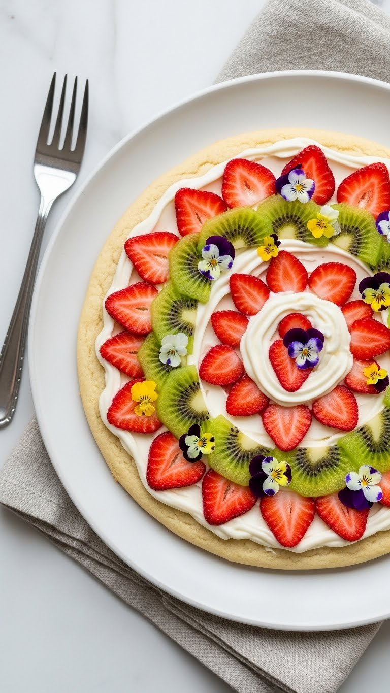 This is the crowd-pleasing classic fruit pizza everyone recognizes. A thick sugar cookie base gives tender chew and buttery flavor. The cream cheese-sour cream frosting adds tang to balance juicy strawberries. Bright fruit arranged in a pretty pattern makes it perfect for parties and picnics.