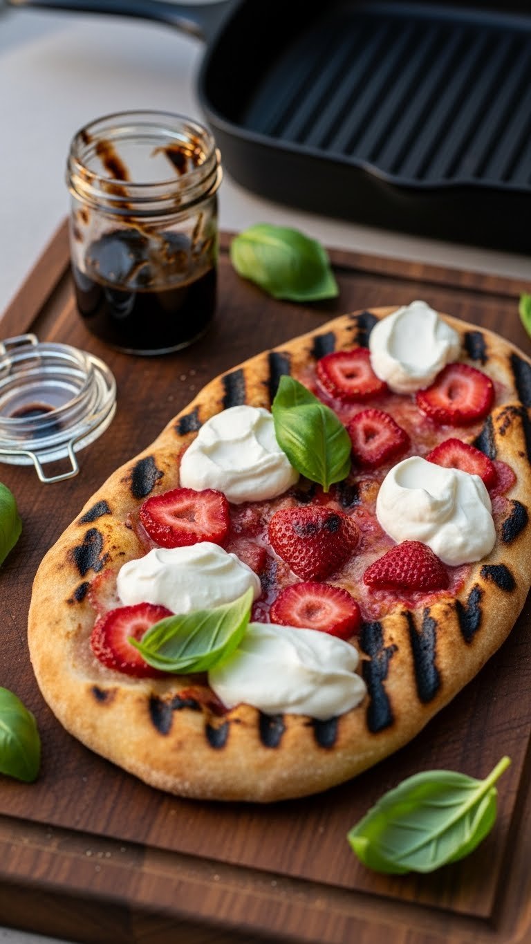 This grilled strawberry pizza flips dessert into smoky-sweet territory. The char on the flatbread and strawberries adds depth to the creamy mascarpone. A bright balsamic reduction ties everything together.