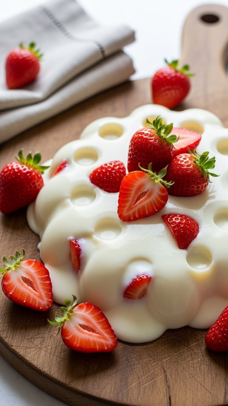 This almond-strawberry poke cake features toasted almonds and a light amaretto drizzle. The nutty notes add depth to the sweet strawberry pockets. It's great for holiday tables and dinner parties. You’ll notice a gentle almond aroma and crisp toasted almond crunch against the soft cake.