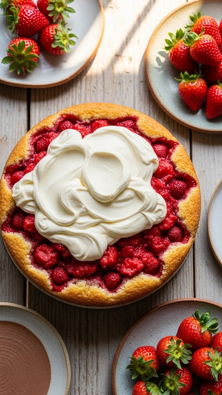 - Before serving, spread 1 cup sour cream mixed with a teaspoon powdered sugar for a tangy finish. Garnish with sliced strawberries.