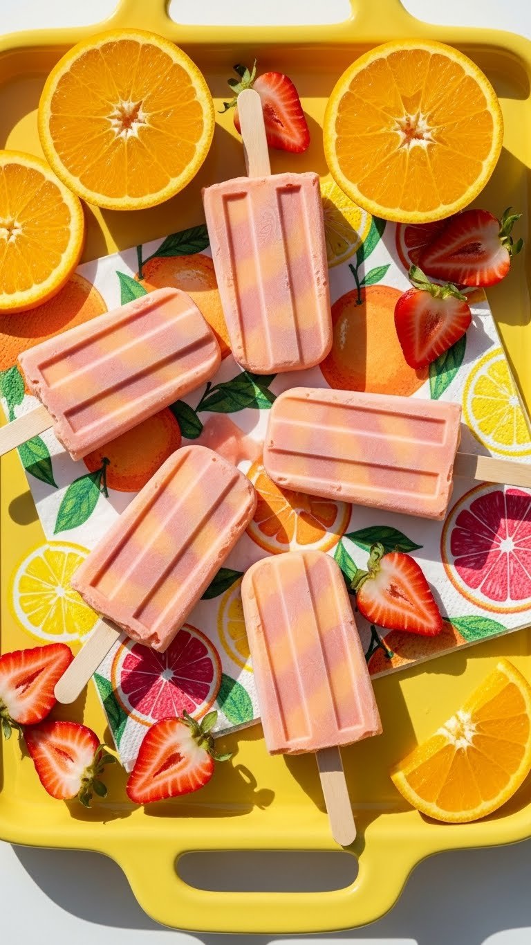 This creamsicle-style strawberry popsicle blends sweet strawberry with zesty orange. It’s creamy and citrus-forward, like a childhood favorite. Texture is smooth and slightly sherbet-like. Ideal for kids who like orange creams. Expect sunny, tangy flavors.
