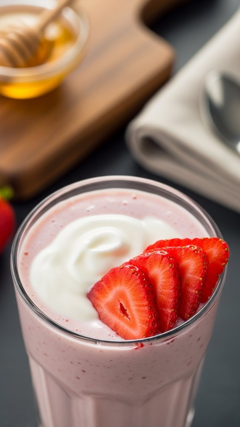 Serve in a chilled tall glass with a swirl of extra yogurt on top. Garnish with sliced strawberries and a sprinkle of oats or chia. Pair with toasted almond butter toast or a banana muffin. Store leftovers in the fridge up to 24 hours in a sealed jar; shake before drinking. For make-ahead, freeze portions of chopped strawberries in freezer bags for quick blending.