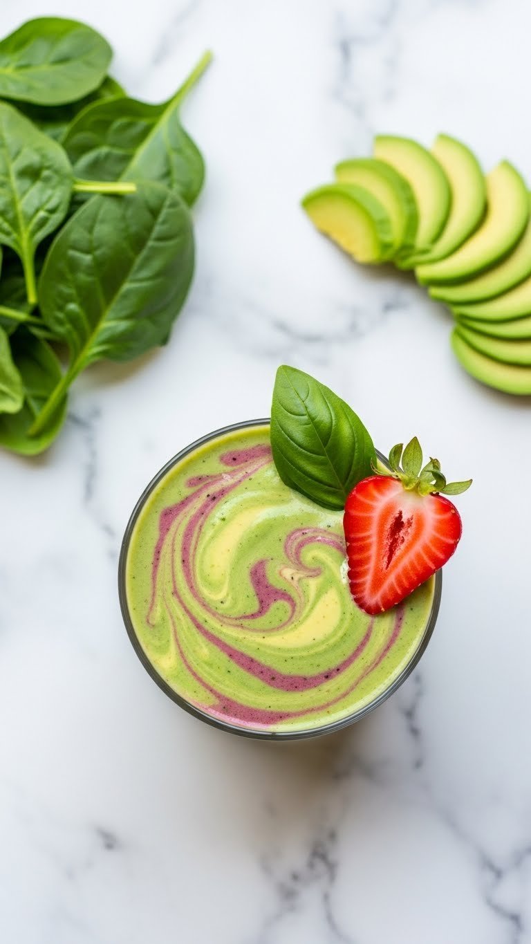 This green smoothie sneaks spinach and avocado into a strawberry base without overpowering the fruit. It’s creamy, slightly sweet, and rich with healthy fats. Perfect when you want a nutrient boost and gentle caffeine-free energy. You’ll notice a smooth, buttery texture and fresh, grassy aroma.