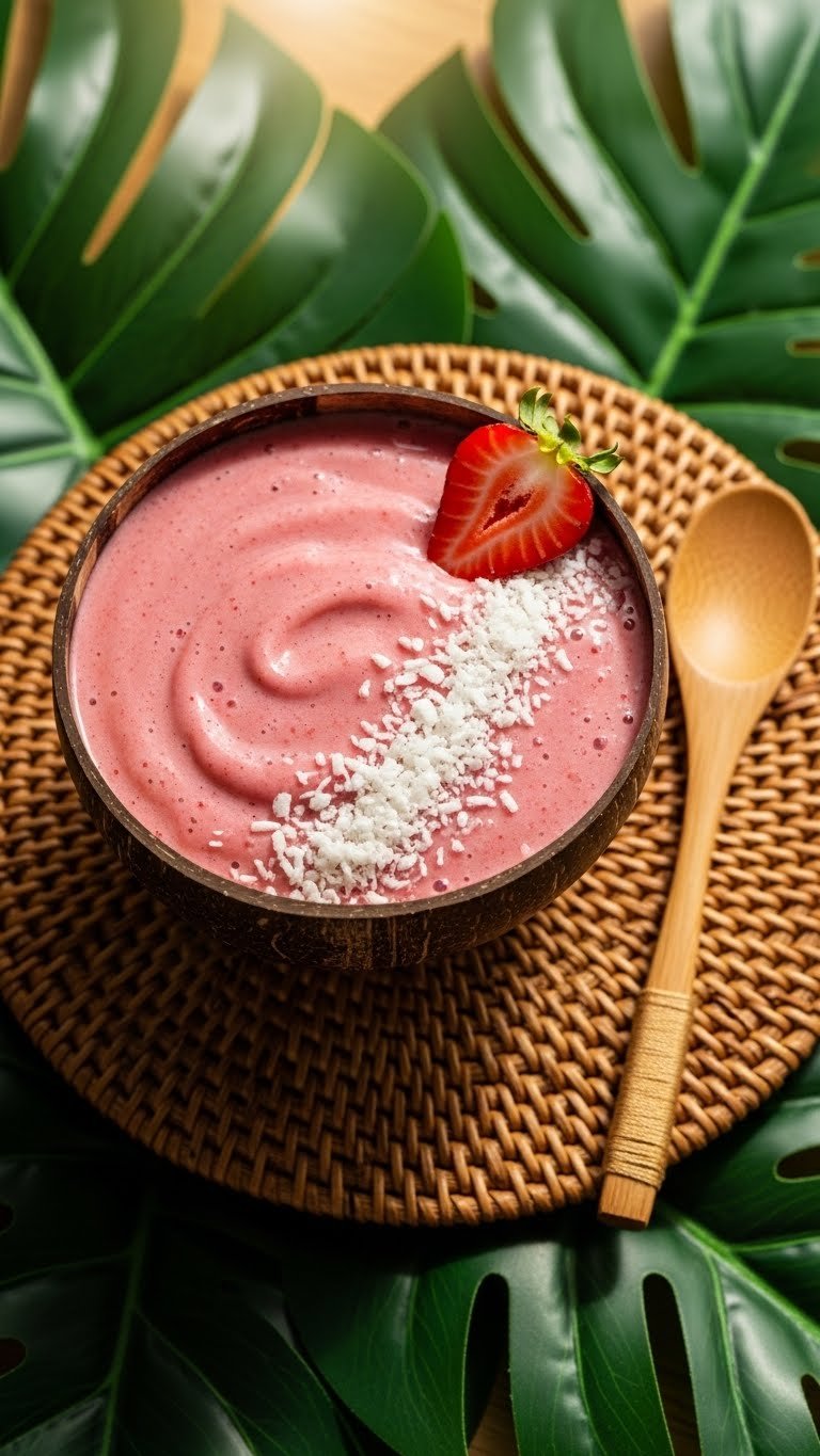 Serve in a coconut bowl or glass with shredded coconut and mint. Pair with a tropical fruit salad or granola. Store in the fridge up to 24 hours; re-blend briefly before serving. For make-ahead, freeze strawberries in single-use portions.