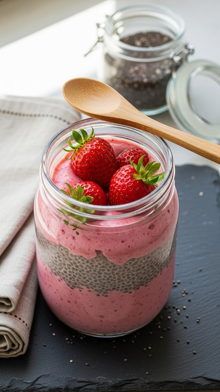 Spoon into a wide jar and top with fresh strawberries and a sprinkle of chia. Pair with a nutty granola or a soft-boiled egg. Store chia gel in the fridge up to 5 days; finished smoothies keep 24 hours refrigerated. Make-ahead: chia gel can be made days ahead.