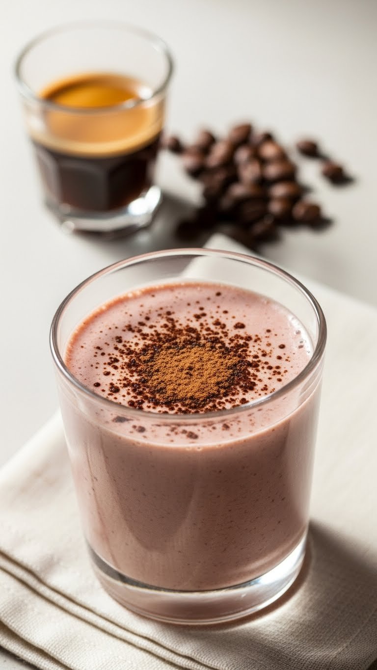 Serve over crushed ice with chocolate shavings and a coffee bean on top. Pair with a cinnamon almond biscotti or a banana. Store in the fridge for up to 12 hours; reblend before drinking. Make-ahead: mix coffee with cocoa powder for a quick base.