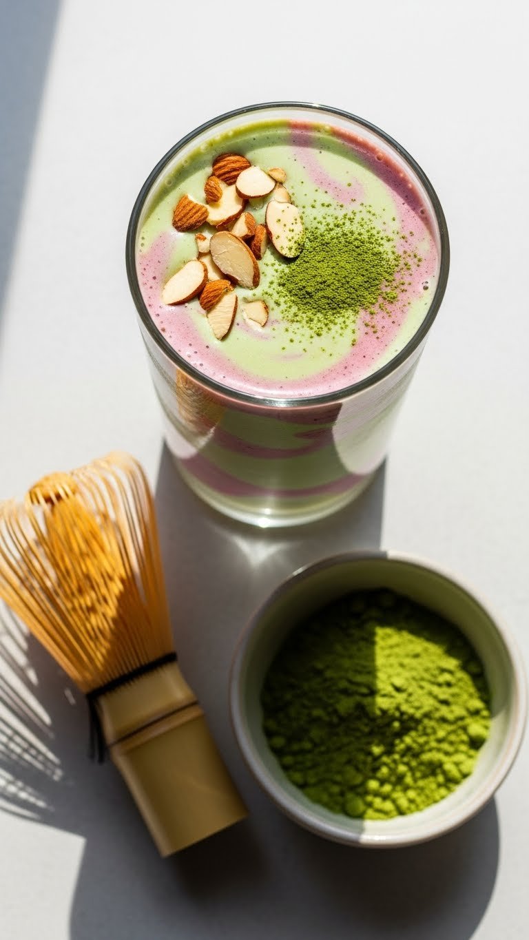 Serve in a clear glass to show the delicate color. Garnish with matcha dust and almonds. Pair with a sesame bagel or a light yogurt bowl. Keep refrigerated up to 12–24 hours; matcha can settle, so stir before serving. Make-ahead: portion matcha paste and frozen fruit.