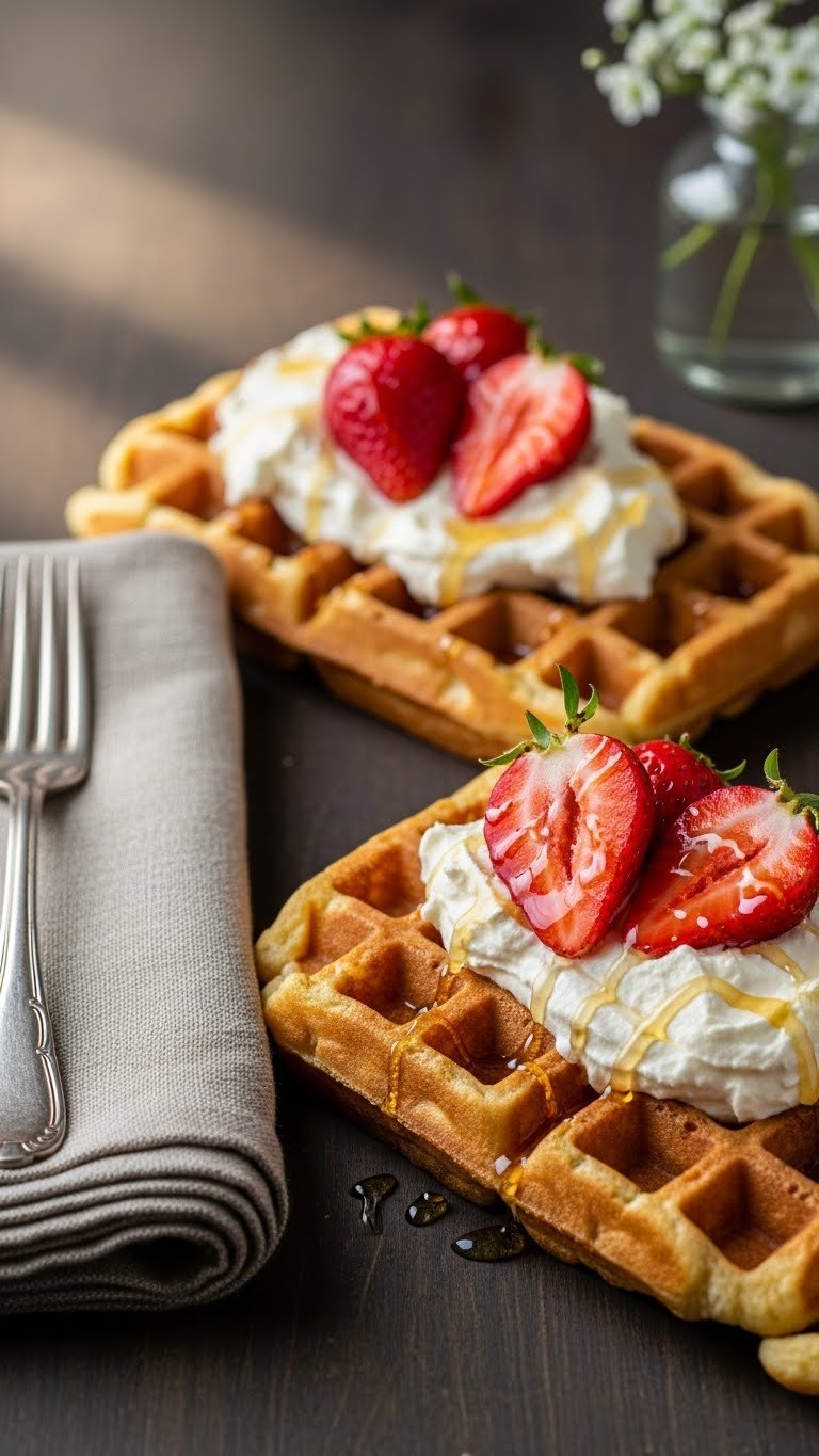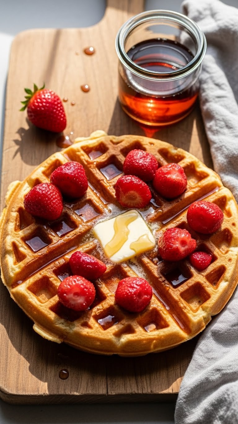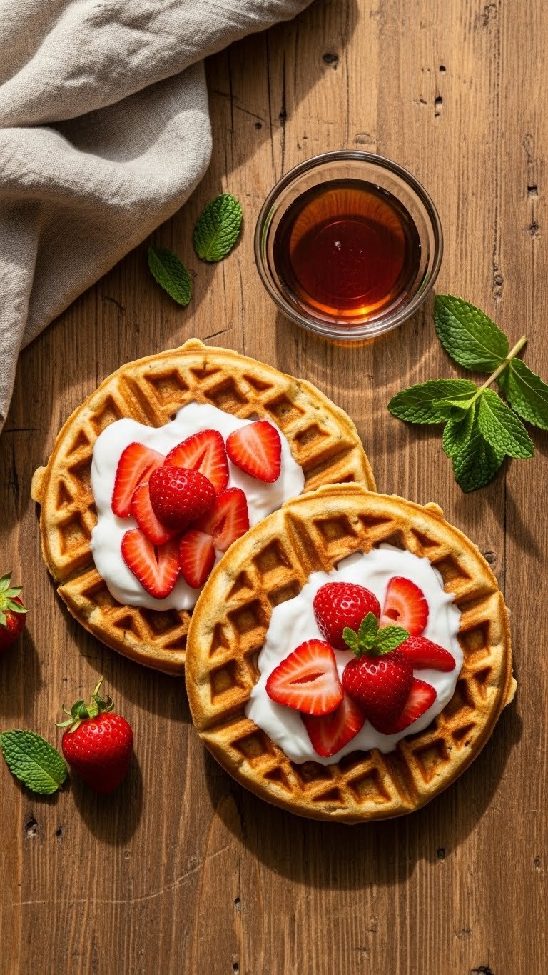 Plate on warm dishes to avoid steam loss. Stack two waffles and layer macerated strawberries between them for height. Garnish with mint leaves and extra butter. Pair with strong coffee or a berry smoothie. Store leftover waffles in an airtight container in the fridge for 2 days; reheat in a toaster or oven at 375°F for 6–8 minutes to restore crispness. Batter can be made ahead and refrigerated for 24 hours.