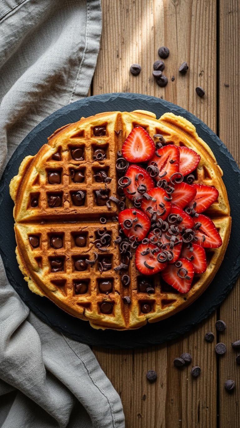 This crispy strawberry waffle with chocolate chips balances sweet, melty pockets of chocolate with tangy strawberries. The batter includes a touch of cocoa for depth and chocolate chips for gooey bites. Crisp edges contrast the soft interior studded with chocolate.
