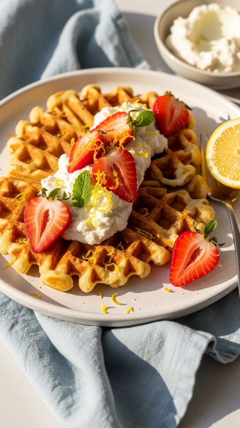 This crispy strawberry waffle blends ricotta and lemon for a light, tangy interior and crisp exterior. Ricotta adds moisture without making the waffle heavy. The lemon zest brightens the strawberries for a sunny flavor.