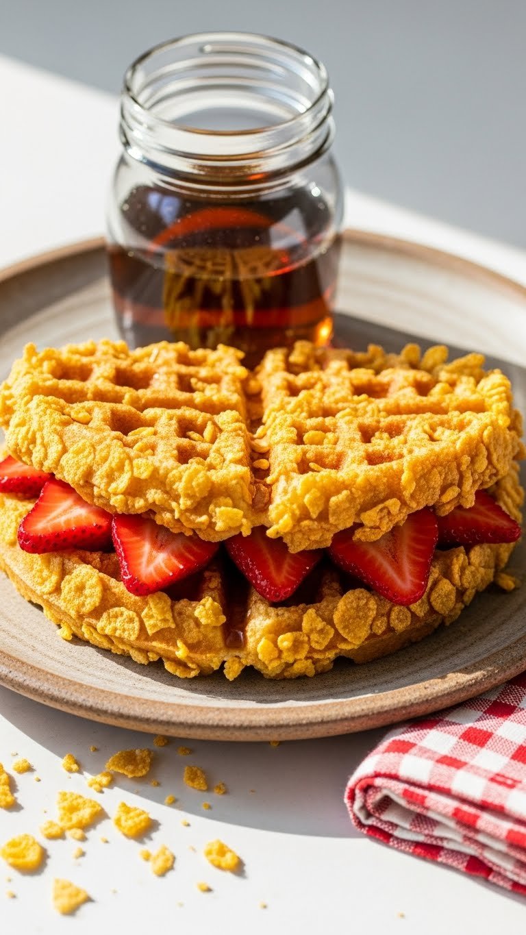 Serve immediately to enjoy the cornflake crunch. Add honey or maple syrup and fresh strawberry slices. A side of Greek yogurt balances sweetness. Store leftovers in the fridge for 1–2 days, then re-crisp in the oven at 375°F for 8–10 minutes. Crush extra cornflakes fresh when reheating to retain crunch.