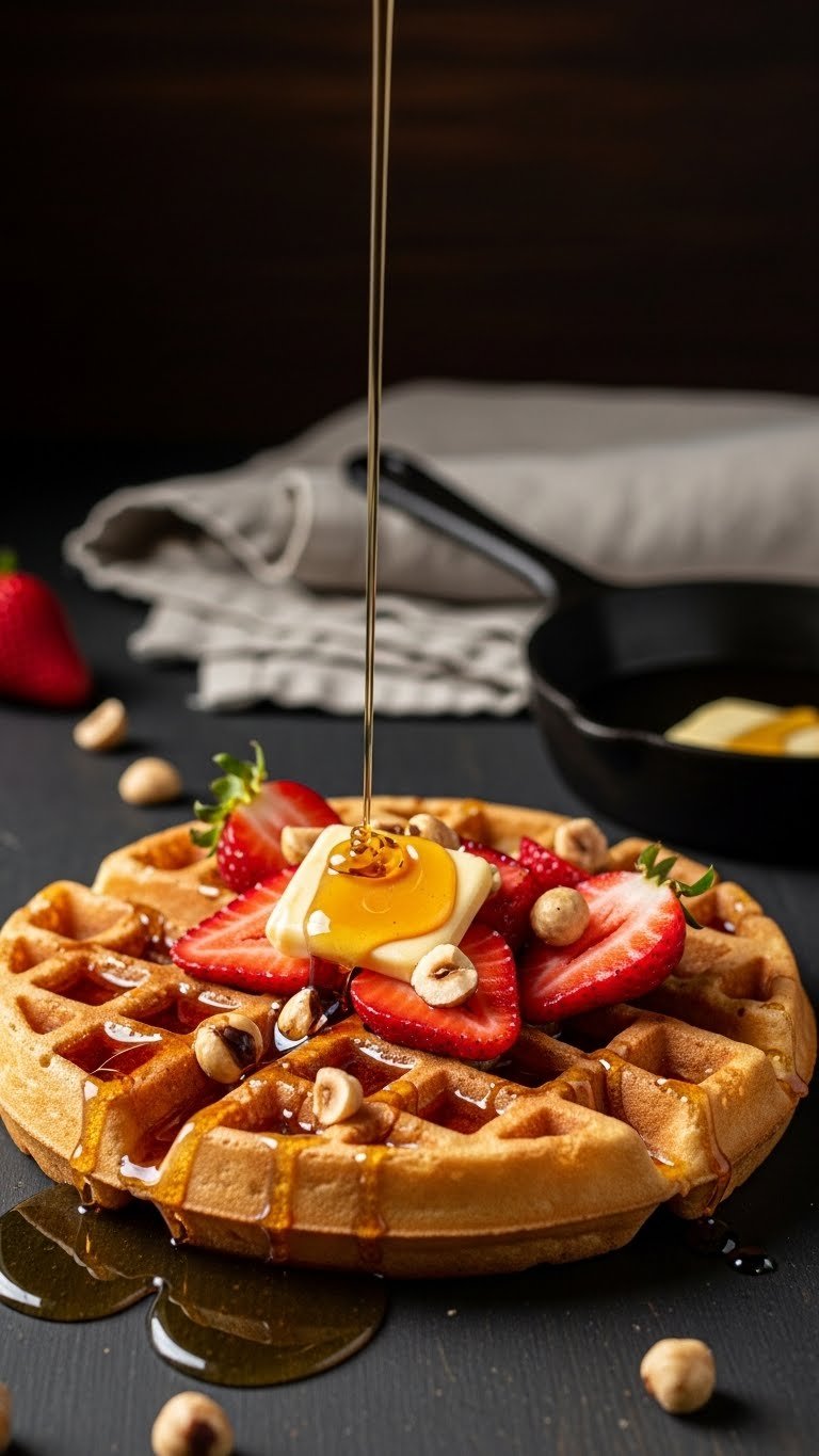 This brown butter crispy strawberry waffle has a nutty, caramel aroma from browned butter and crunchy toasted hazelnuts. The brown butter adds depth, while hazelnuts create a toasty contrast to juicy strawberries.