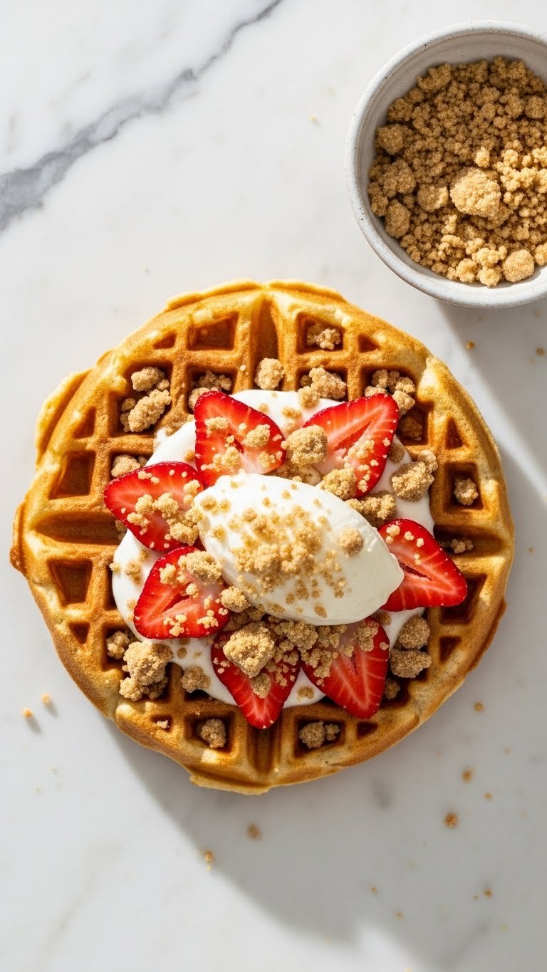 Serve warm so streusel stays crunchy. Add a scoop of vanilla yogurt or ice cream for richness. A dusting of powdered sugar adds a finish. Store waffles in the fridge 2 days; re-crisp at 375°F for 8 minutes. Make extra streusel and freeze for future use.