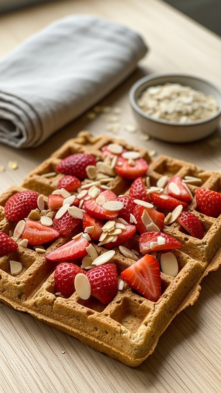 Serve with a smear of almond butter and fresh strawberry slices. Pair with a nut milk latte. Store waffles in the fridge for 2 days; reheat in oven to preserve crispness. Batter can be prepared a few hours ahead; brief rest improves texture.