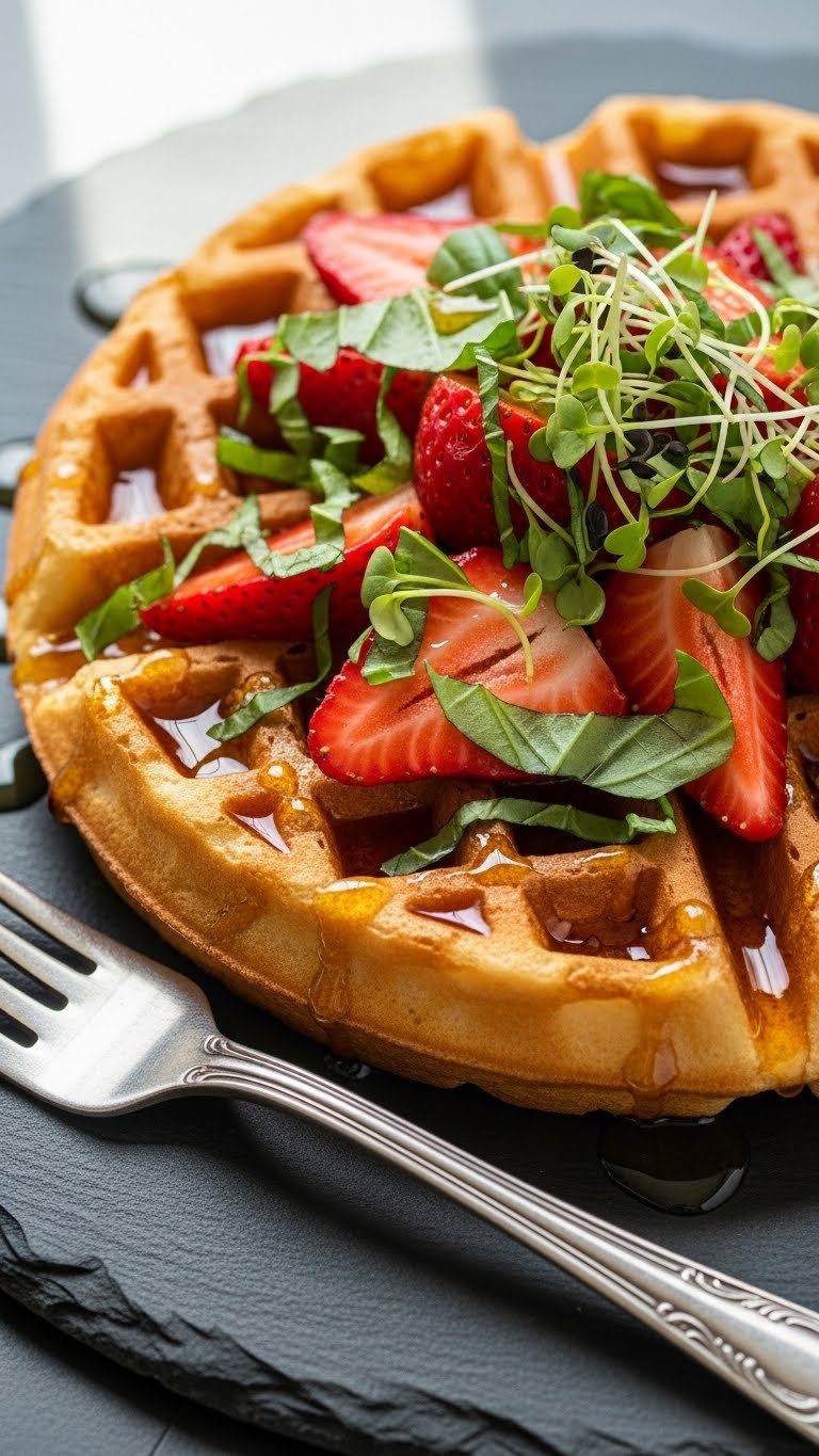 This savory-leaning crispy strawberry waffle pairs fresh basil with strawberries and a honey-balsamic glaze. A pinch of black pepper and a touch of Parmesan in the batter keeps it balanced. The waffle still gets crisp edges, while flavors lean sweet-savory.