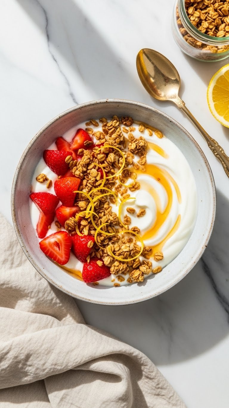This bowl pairs bright lemon with sweet strawberries and crunchy granola. The tart Greek yogurt balances the honey, while lemon zest lifts the whole flavor. It’s classic breakfast comfort with a photogenic look. You’ll love the contrast of textures — creamy, crunchy, and juicy. The aroma of lemon and warm honey is inviting.