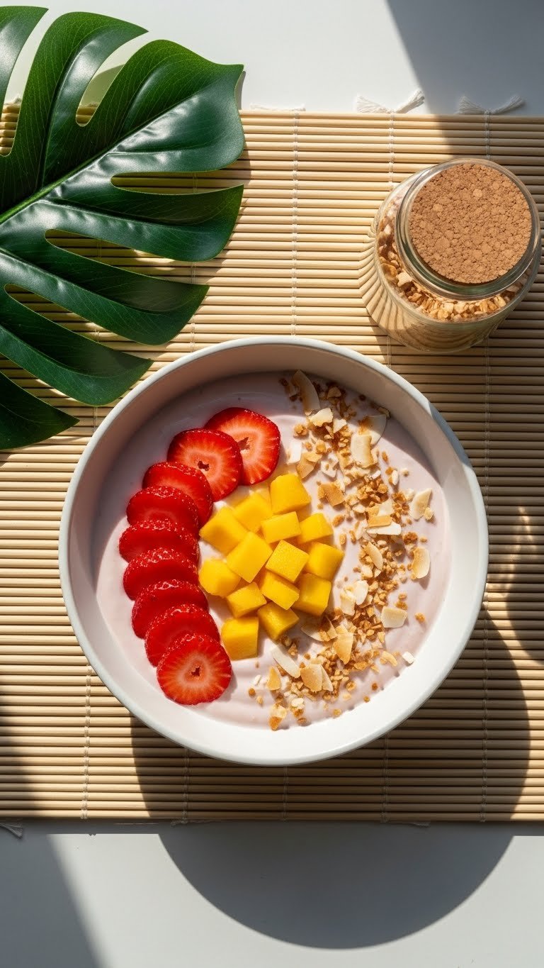 This tropical bowl mixes creamy coconut yogurt with strawberries and mango. It tastes bright, slightly sweet, and very creamy. Toasted coconut adds crunch and aroma. It’s perfect for warm mornings or poolside brunches. You’ll notice floral coconut notes and juicy fruit bursts.