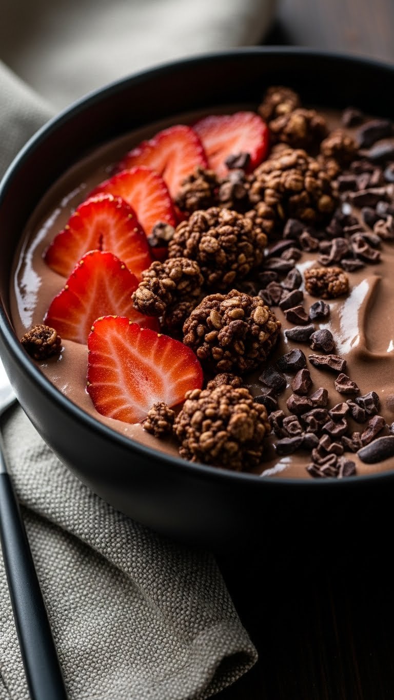 This bowl satisfies chocolate cravings without heavy dessert. Cocoa yogurt or chocolate-flavored Greek yogurt adds depth. Strawberries bring acidity to cut the richness. Crunchy cocoa granola and cacao nibs add texture. You'll love the bittersweet notes and silky mouthfeel.