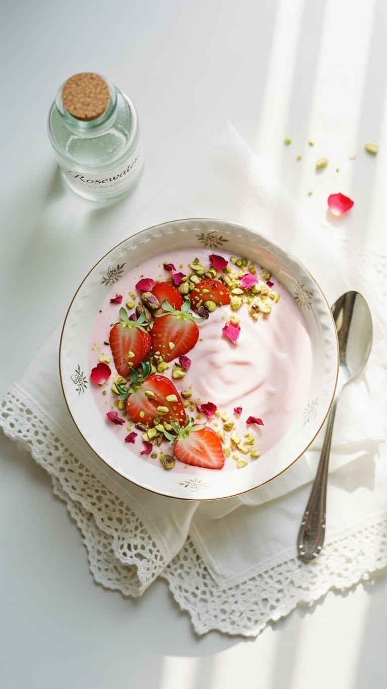 5. Pretty Strawberry Yogurt Bowl with Rosewater and Pistachios