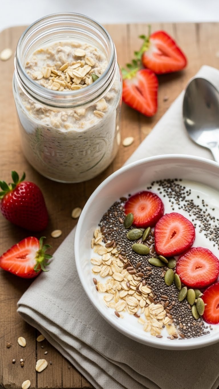 Serve in a mason jar or clear bowl for layers to show. Add a drizzle of honey and extra nuts for crunch. Pair with black coffee or yogurt smoothie. Store overnight oats in fridge up to 3 days. Make-ahead: prep multiple jars for weekday breakfasts.