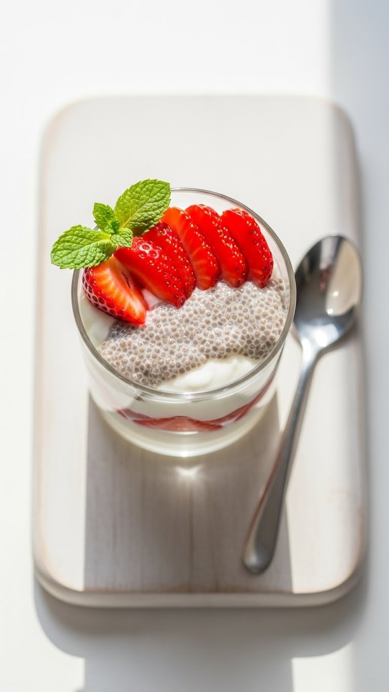 - In a cup, layer yogurt, chia pudding, and strawberries.