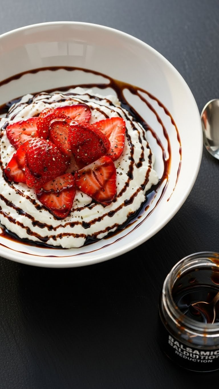 This bowl uses ricotta blended with yogurt for a lusciously creamy base. A sweet balsamic drizzle brings acidity and depth to strawberries. Cracked black pepper is a surprising finishing touch. It’s refined and slightly savory-sweet. You'll notice silky texture and complex flavor notes.