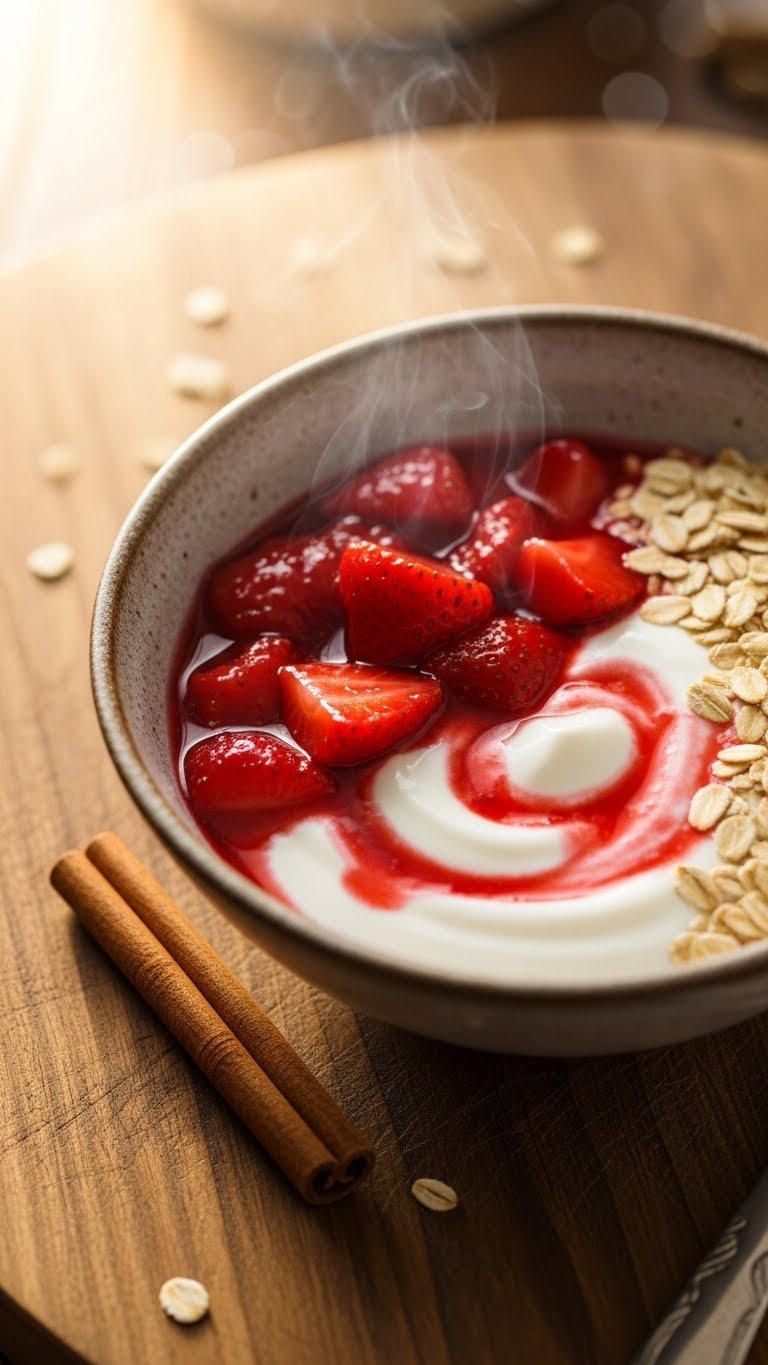 Serve in a deep bowl so yogurt and compote layer nicely. Garnish with a cinnamon stick and extra toasted oats. Pair with chai tea or hot coffee. Store compote in fridge up to 5 days; reheat gently before serving. This warm option adds cozy variety to your pretty strawberry yogurt bowls.