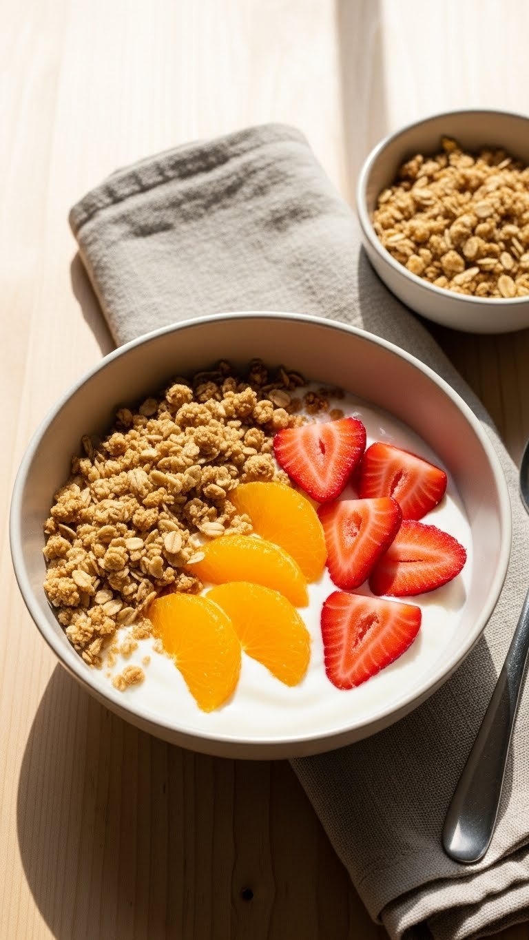 Citrus brightens this strawberry yogurt bowl. Orange segments add juicy acidity and floral notes. A buttery oat crumble gives warm crunch. It’s balanced, slightly sweet, and very satisfying. You’ll enjoy the sunny flavors and the toasty crumble aroma.